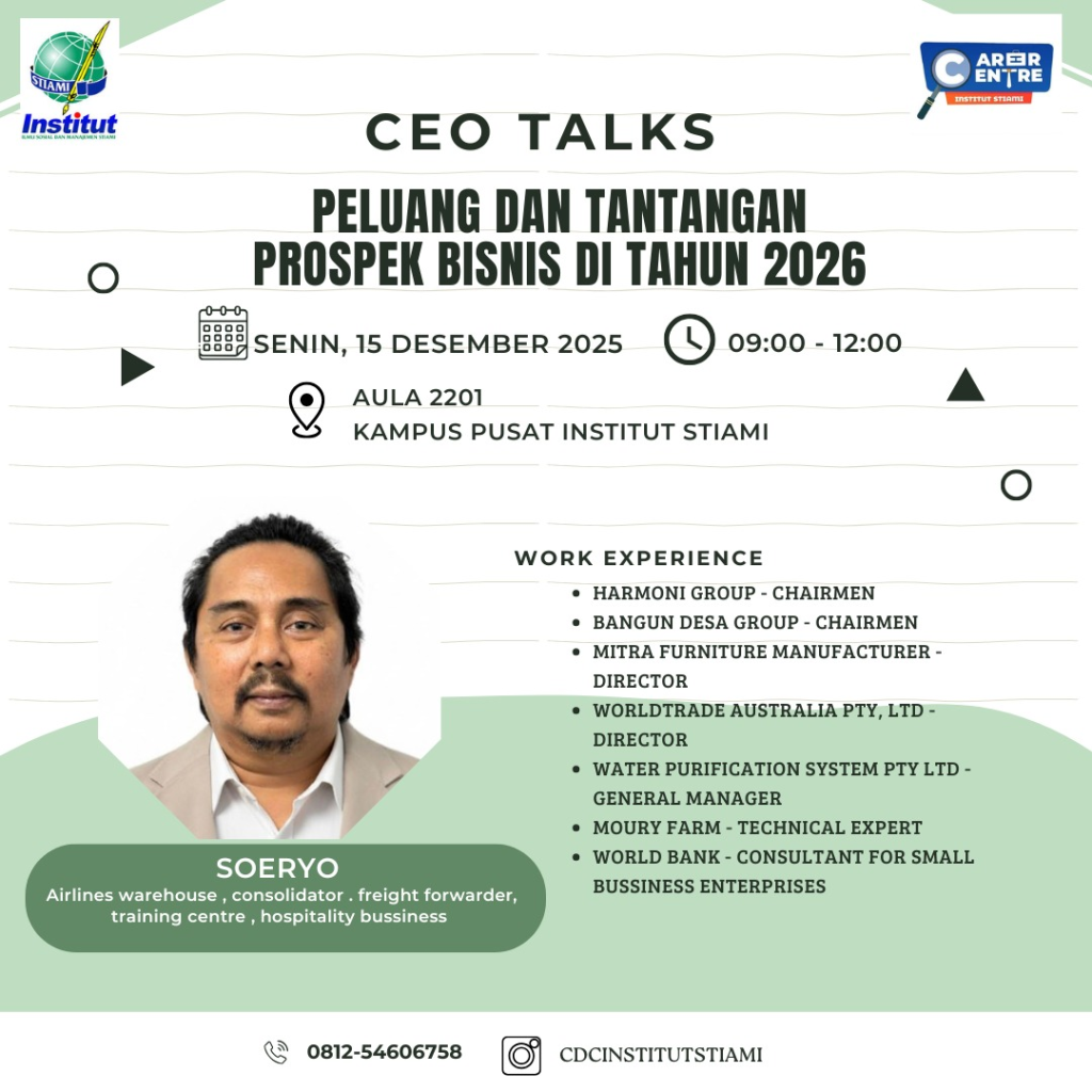 Career Centre Institut STIAMI dengan hormat mengundang Bapak/Ibu serta mahasiswa/i untuk menghadiri kegiatan CEO Talks yang mengangkat tema “Peluang dan Tantangan Prospek Bisnis di Tahun 2026”. Acara ini bertujuan memberikan wawasan strategis mengenai perkembangan dunia bisnis di tahun mendatang.